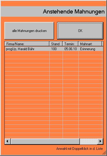 Das Fenster erscheint automatisch bei jedem Programmstart, wenn Sie diese Einstellung so bei Grunddaten der Buchhaltung getroffen haben. Sie können das Fenster aber auch jederzeit über die Schaltfläche 'anstehende Mahnungen auflisten' auf Lasche 5: Buchhaltung aufrufen.
