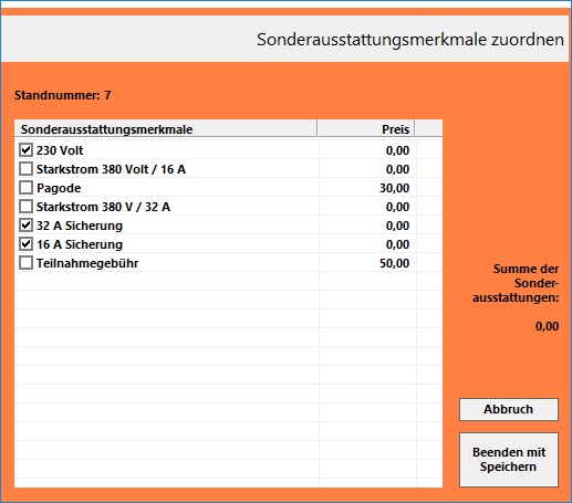 Sie öffnen dieses Dialog-Fenster, indem Sie auf der Lasche 3 Stände die Schaltfläche Sonderausstattung klicken.