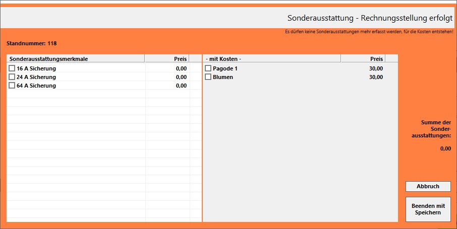 Wenn Sie die Sonderausstattungsmerkmale des Standes markiert haben, klicken Sie diese Schaltfläche. Die Summe der gewählten Sonderausstattungen wird dann zum Stand addiert. - Wenn Sie sich bei der Zusammenstellung geirrt haben sollten, so wählen Sie die Schaltfläche 'Abbruch'. Die alte Auswahl wird wieder hergestellt.