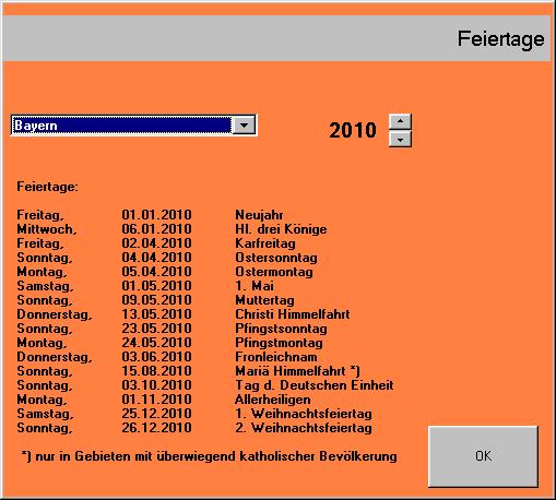 Das Fenster zum Anzeigen der Feiertage öffnen Sie über das Menü 'Optionen->Feiertage'.