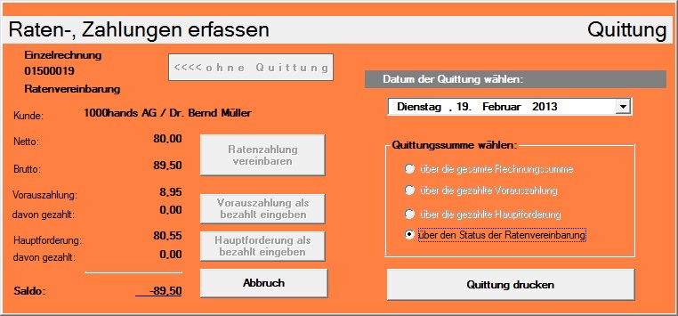 Das Fenster vergrößert sich um die Steuerelemente, die Sie für den Ausdruck einer Quittung benötigen. Wenn Sie die Schaltfläche erneut klicken, verschwinden diese wieder.