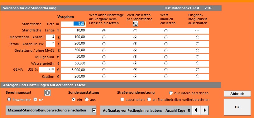 Geben Sie die Anzahl bzw. die Euro-Werte der Felder 'Marktstände Anzahl/Preis', 'Strom Anzahl in KW/Preis', 'Gestattung', 'Wasser-', 'Müllgebühr', 'Standlänge' und eventuell 'GEMA MWSt./Preis' ein. Diese Werte sind Vorgaben für die Erfassung von Ständen.