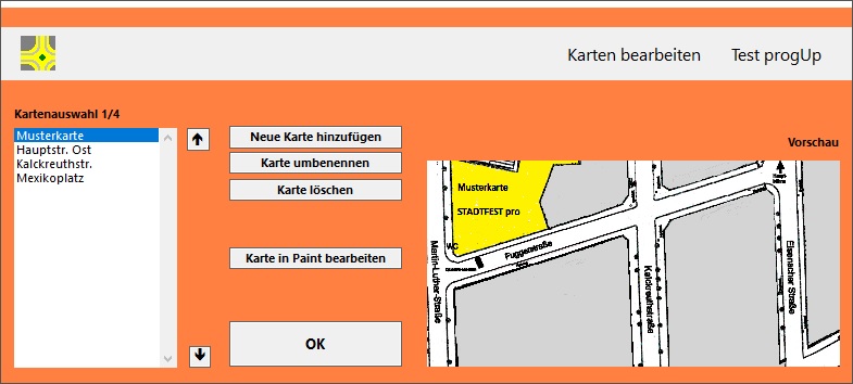 Karten bearbeiten bzw. importierenDas Einladen der Karte bzw. Karten erfolgt über das Menü 'Kartenbearbeitung->Karten bearbeiten/importieren'. - Falls Sie noch keine Karte zur Verfügung haben, so lesen Sie bitte vorab Karten allgemein. - Das Fenster zur Kartenbearbeitung können Sie nur öffnen, wenn Sie die Version STADTFEST pro erworben haben.