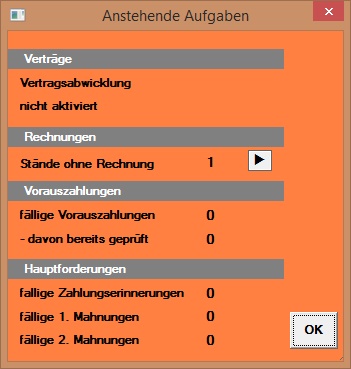 Dieses wichtige Dialog-Meldefenster informiert sie über den Stand der Auftragsbearbeitung. Genauer gesagt über die Aufgaben, die für die korrekte Abwicklung der Standvermietungen gerade anstehen.