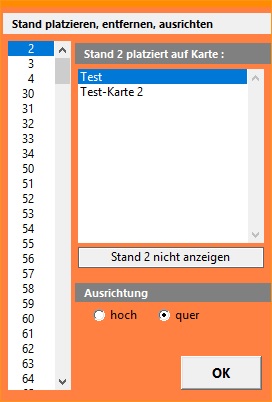 Der markierte Kartenname bezeichnet die Karte, auf der der gewählte Stand platziert ist. Um den gewählten Stand auf einer anderen Karte zu platzieren klicken Sie auf einen anderen Kartennamen. - Ist kein Kartenname markiert, so ist der Stand unplatziert.