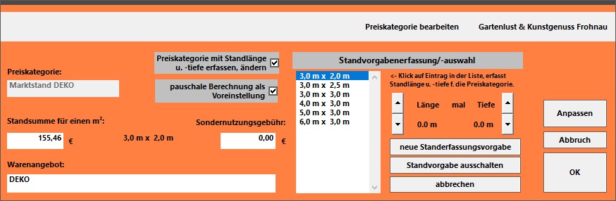 Preiskategorie mit Standlänge und -tiefe erfassen, ändernPreiskategorie mit Standlänge und -tiefe erfassen, ändern