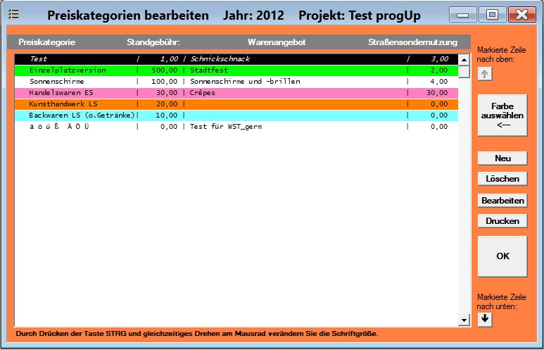 Um eine Streuung gleichartiger Stände über den gesamten Festplatz zu erreichen können den Preiskategorien Farben zugeordnet werden.