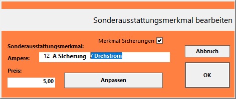 Wählen Sie die Schaltfläche 'Neu' und setzen Sie den Haken bei Merkmal Sicherungen . Erfassen Sie die Ampere-Zahl der Sicherung, die Ihr Kunde bei einem Drehstromanschluss benötigt. Der Eintrag wird als Vorgabe ergänzt durch den Text ' A Sicherung'. Sie können Ihre Eingabe im nachfolgenden Feld zusätzlich spezifizieren.