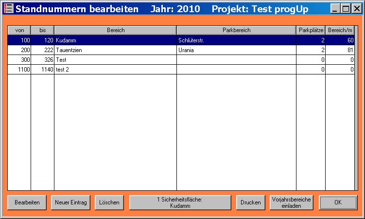 Klicken Sie auf die Schaltfläche 'Neuer Eintrag'. Geben Sie die Standnummern von/bis ein. Geben Sie dem Bereich einen sinnvollen (s.o.) Namen. Falls Ihnen Parkplätze zur Verfügung stehen, so geben Sie bitte den Parkbereich ein und wie viele Parkplätze zum Parkbereich gehören. (Näheres zum Parkbereich erfahren Sie unter Registerlasche 3 Stände.)