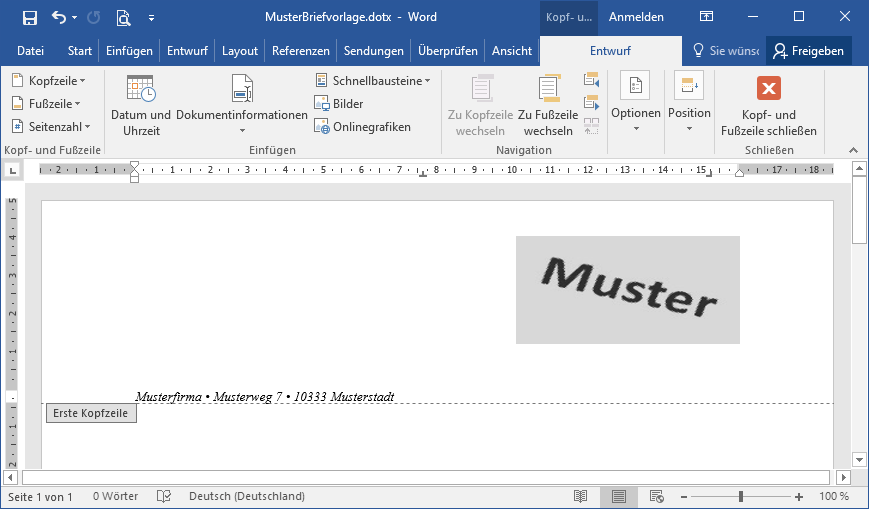 2. Über der Linie Erste Kopfzeile erzeugen Sie bitte mit Enter so viele Zeilen bis die Linie einen Abstand von ca. 5 cm von oben aufweist. - Schreiben Sie Ihre Absenderzeile linksbüdig über die Kopfzeilen-Linie.